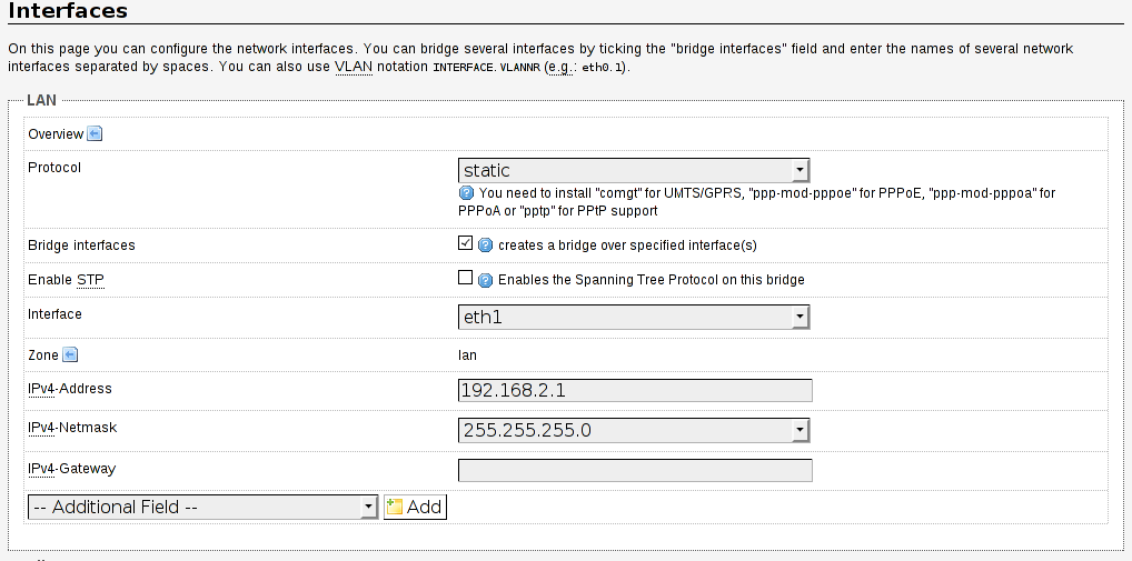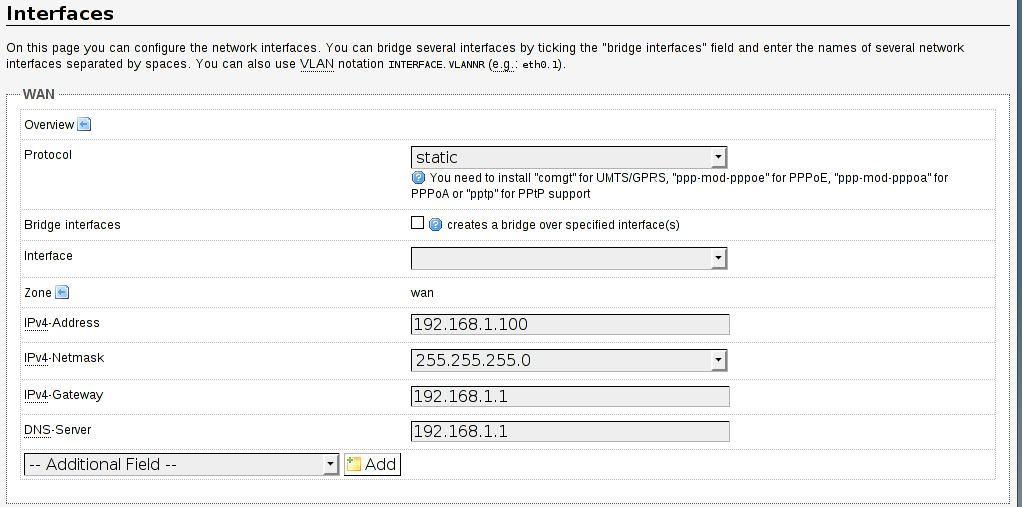 0.d. Ir a Administración -> Network -> Interfaces -> Wan, poner Wan en protocolo “static”