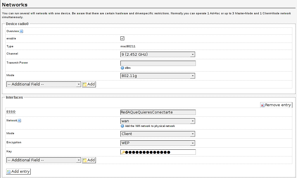 Captura de la configuración de Administration – Network – Wifi- Radio0 (Acá el router al que me conecto es WLAN_B9 en el canal 9)