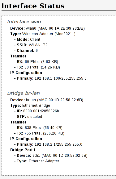 Incluyo como archivos adjuntos las capturas de pantalla de las configuraciones pertinentes de la interfaz gráfica del router accesible desde el navegador web, del status final de las interfaces (también en la interfaz gráfica), y de los archivos /etc/config/network y /etc/config/wireless del router accesibles desde telnet o ssh. Tal que: