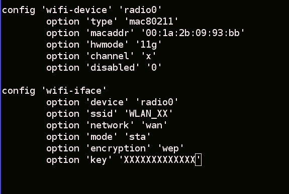 Captura del archivo /etc/config/wireless (acá router al que nos conectaremos es WLAN-XX, introducir la contraseña, el canal, y el nombre del router pertinente)
