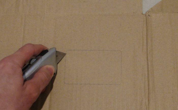 - 3) Con un cuchillo, navaja, cortador o cortacartón cortar por la línea del contorno dibujado en el paso anterior para crear un hueco ajustado a la tarjeta bancaria. Precaución: apoyar el cartón en el suelo u otra superficie que no se raye (o cortar con el cartón sostenido en el aire o colocado entre las piernas).