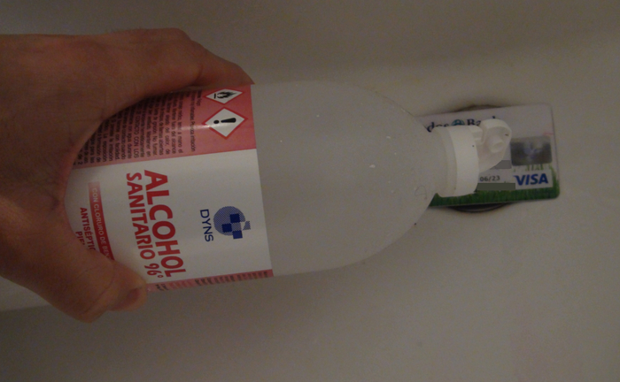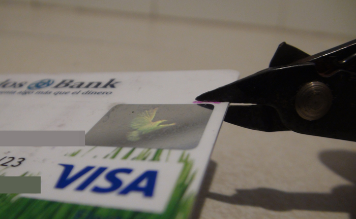 - 2) Corte de una de las esquinas de la tarjeta situados en el lado estrecho contrario al chip, usando unos alicates de corte fino, tijeras, cuchillo, sierra o herramienta rotatoria de mano tipo Dremel con disco de corte. Requiere que la tarjeta se trasparente lo suficiente al colocarla contra un foco luminoso (lámpara o linterna) potente en un ambiente oscuro como para permitir ver el circuito antena (dado que el diseño del circuito varía entre tarjetas, pudiendo estar más o menos próximo del borde de la tarjeta y pudiendo llegar o no a la esquina sin banda magnética mas alejada del chip).